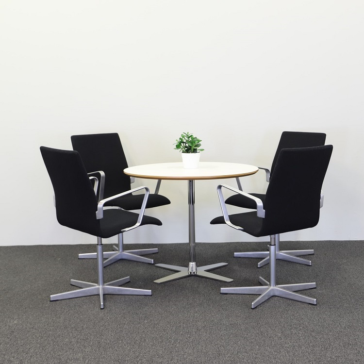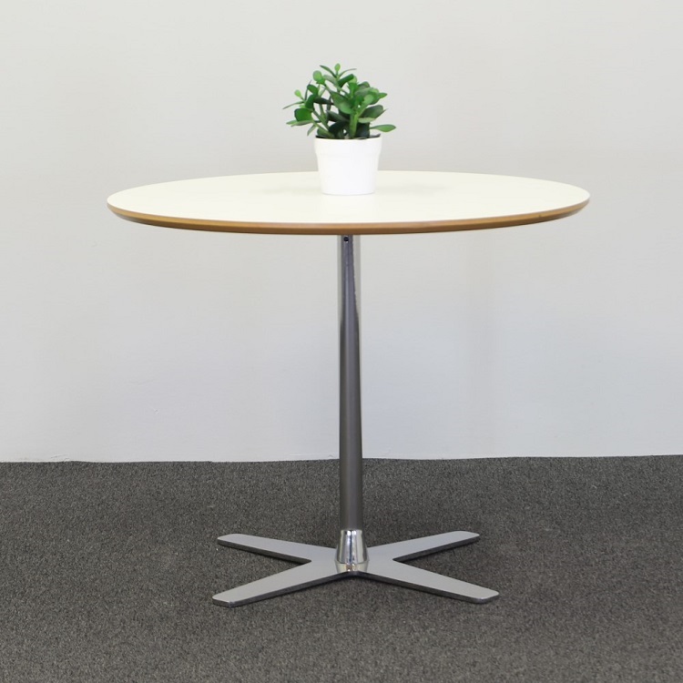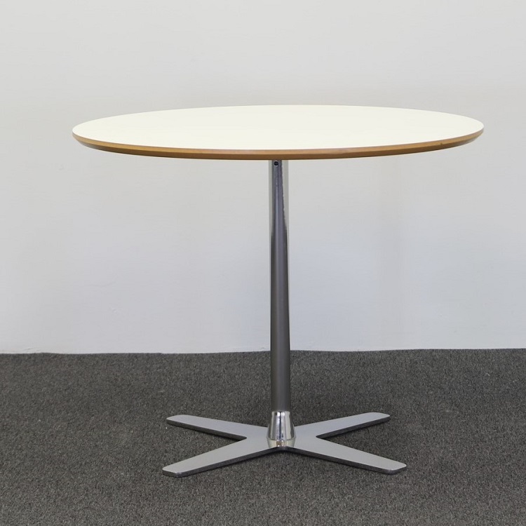Dags för en kaffepaus eller ett snabbt möte? Propeller från Offecct är ett nätt bord med smalt, kromat stativ som avlutas i en fyrdelad, propeller fot. Ett högkvalitativt bord med rund bordsskiva i högtryckslaminat, vitt utförande med en underkant i två olika nyanser av trä. Bordsskivans runda form är inbjudande för härliga samtal och måltider som gör att alla ser och hör varandra, vilket passar utmärkt för spontana möten och fikapauser. Har plats för 3-4 personer.