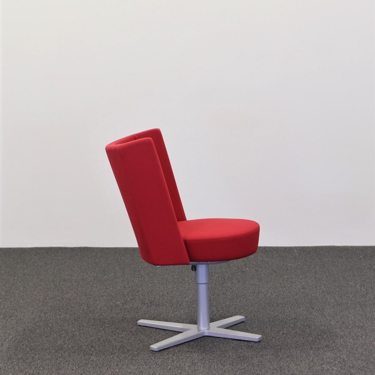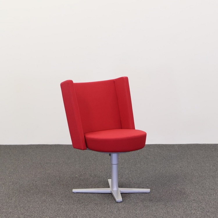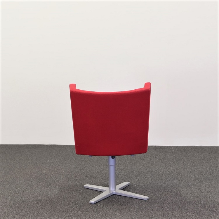 Ryggens utformning erbjuder möjlighet till individuellt sittande som passar olika typer av kroppar. Centrum har ett stativ med snurrfunktion och retur gjord i stål med pulverlack för en snygg matt yta. Fåtöljens klarröda klädsel sätter en elegant touch på rummet samtidigt som man ger rummet en härlig färgklick!