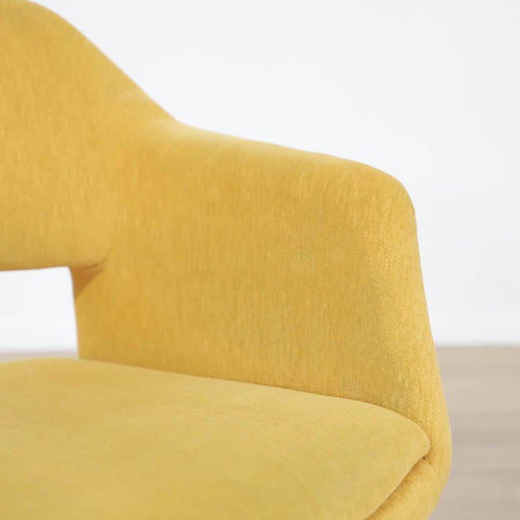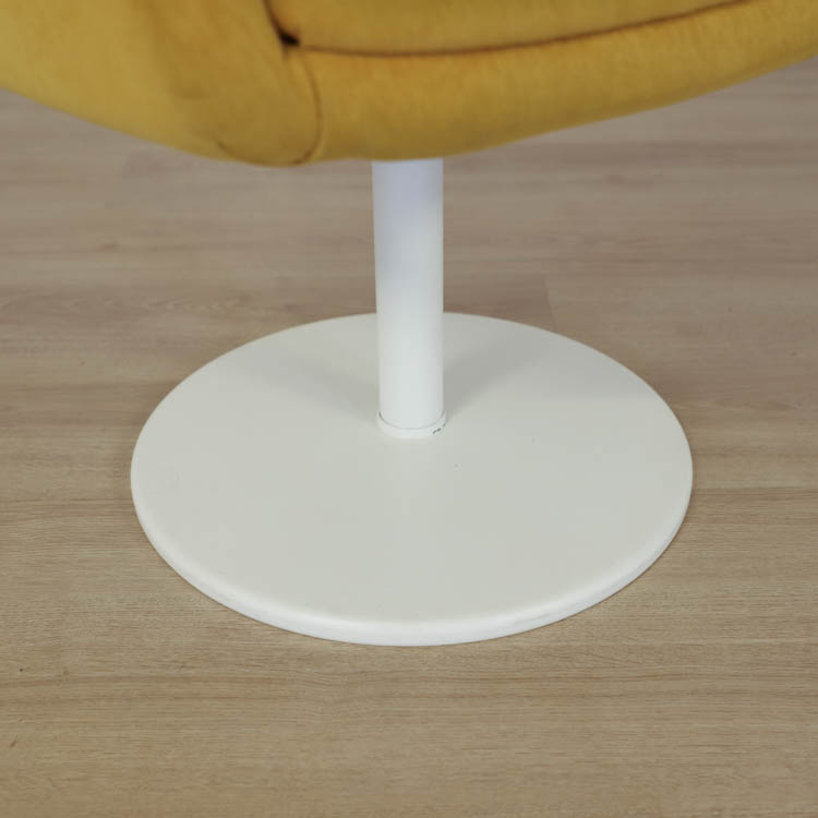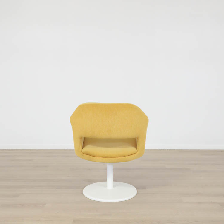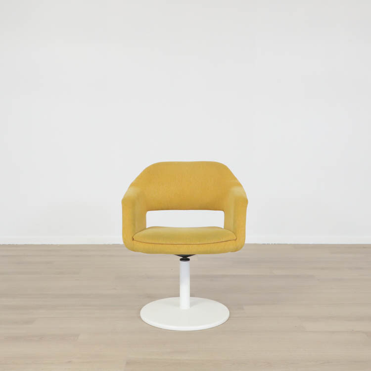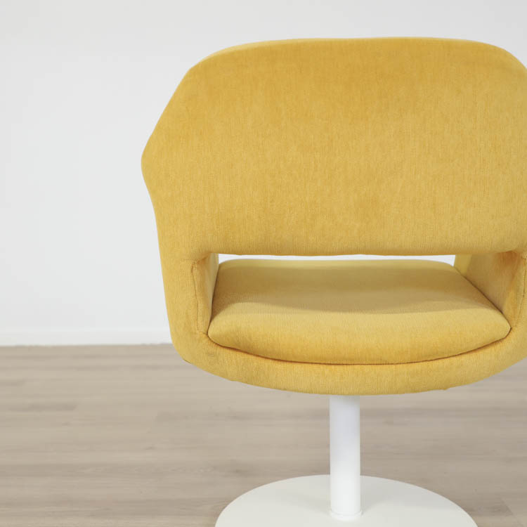 iøjnefaldende lænestol betrukket med sennepsgult tekstil. Hvid ramme med rund
