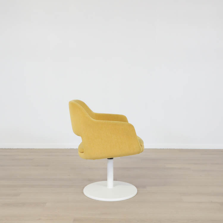 Largo från Johanson Design är en iögonfallande fåtölj klädd i senapsgul textil. Vitt stativ med rund fot som är möjlig att rotera i den ställning som passar. En fåtölj du kommer trivas i under långa sittningar under möten och andra tillställningar på kontoret, eller i loungedelen.