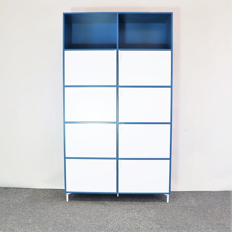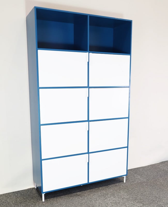 Rymligt förvaringsskåp från Mitab i blått som ger en härlig färgklick med vita luckor. Skåpet är över två meter högt och erbjuder gott om plats med både dold och öppen förvaring. De diskreta handtagen och stilrena fötterna bidrar till en luftig känsla och gör att det här blir en förvaringsmöbel som passar bra både i hemmet och på arbetsplatsen.