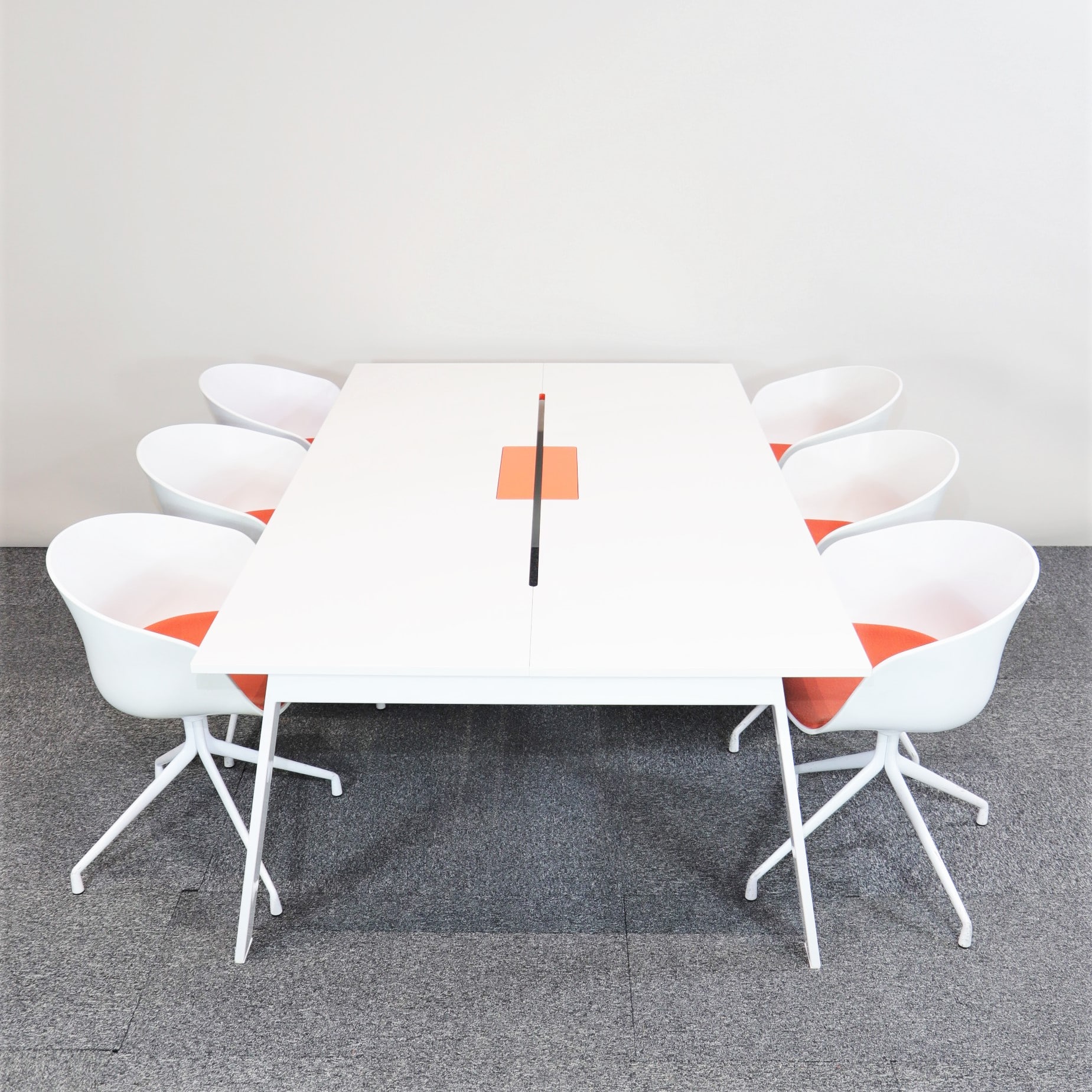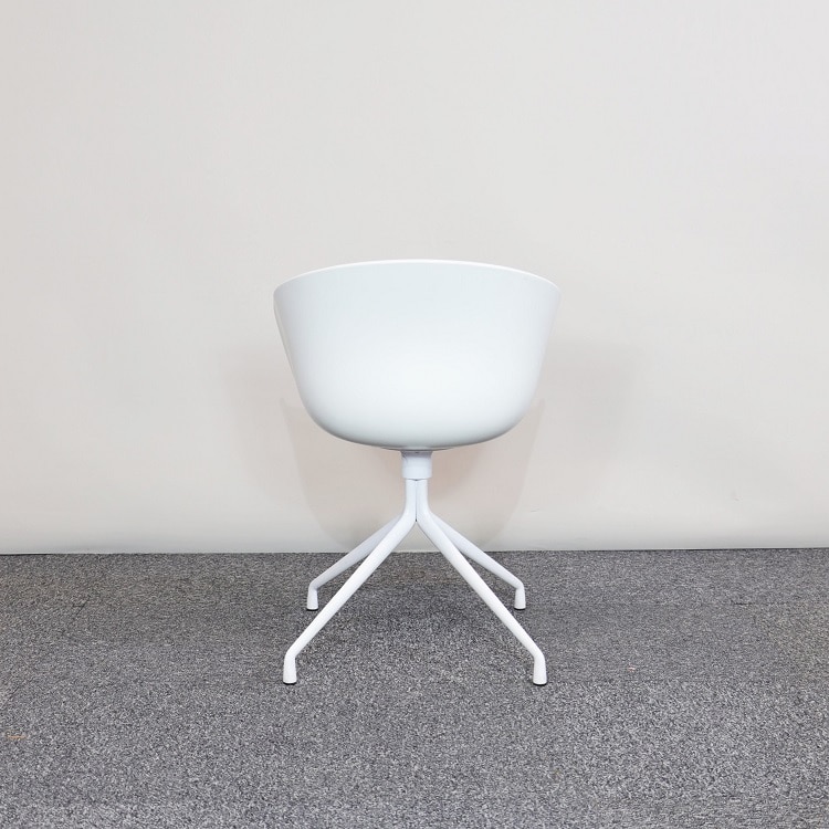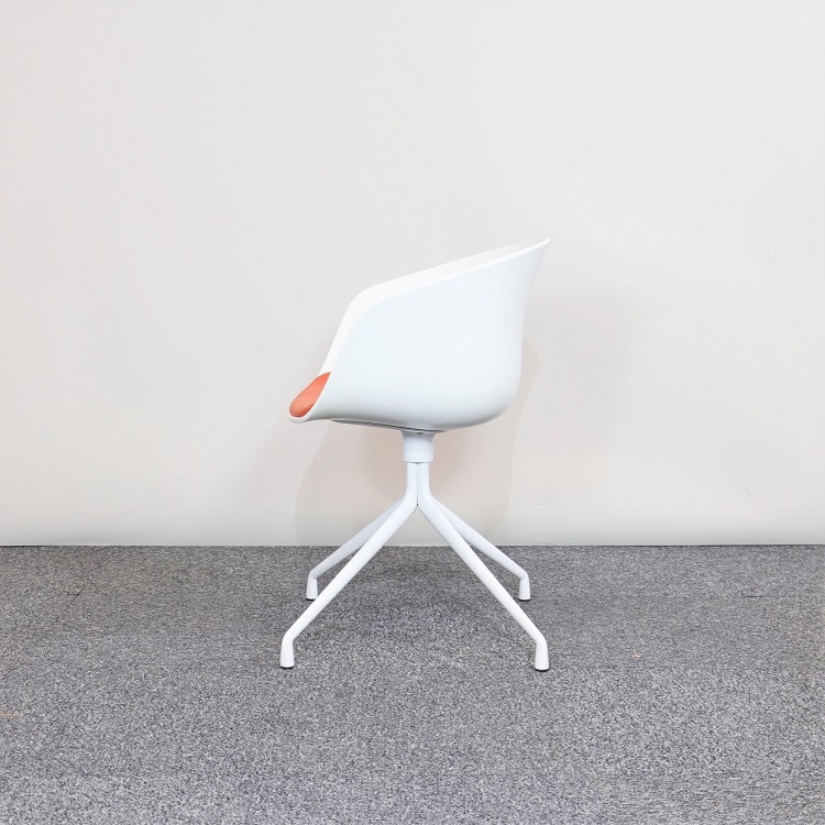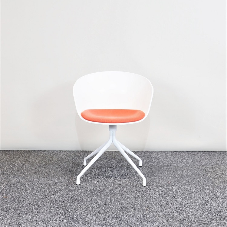 Modell med rundad rygg och armstöd. Detta är en fin stol som sticker ut i mängden. Modellen About a Chair kommer från det danska varumärket HAY och är designad av Hee Welling. Tanken bakom designen var att göra en stol med ovanligt enkel design som passar i princip var som helst. En bekväm, snurrbar stol med ett vitt fint stativ och orange kudde som ger en extra härlig färgklick i mötesrummet eller konferenssalen.