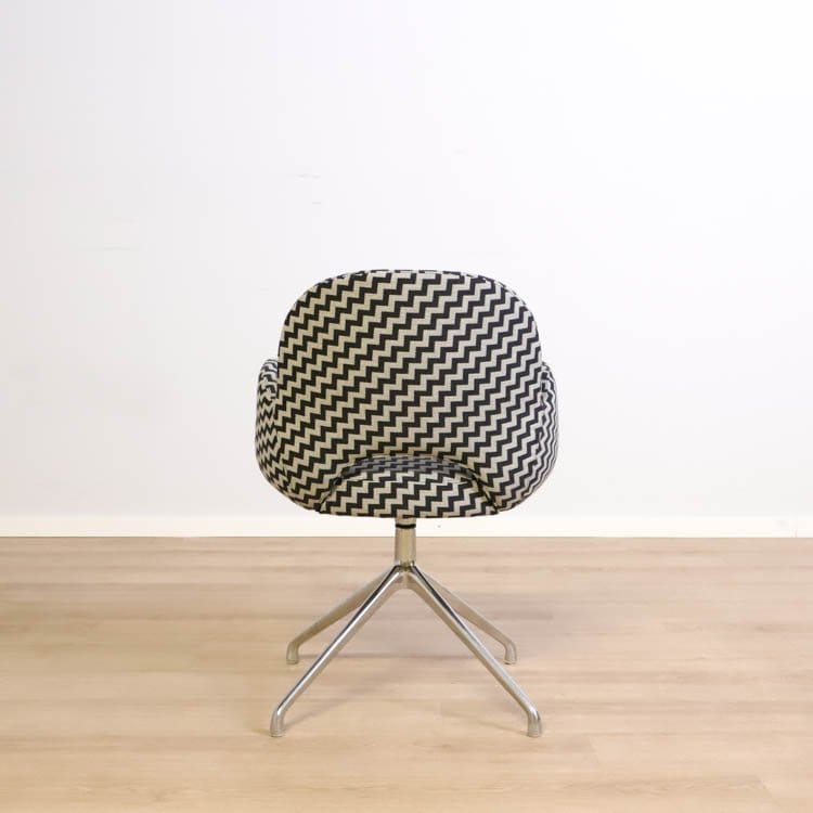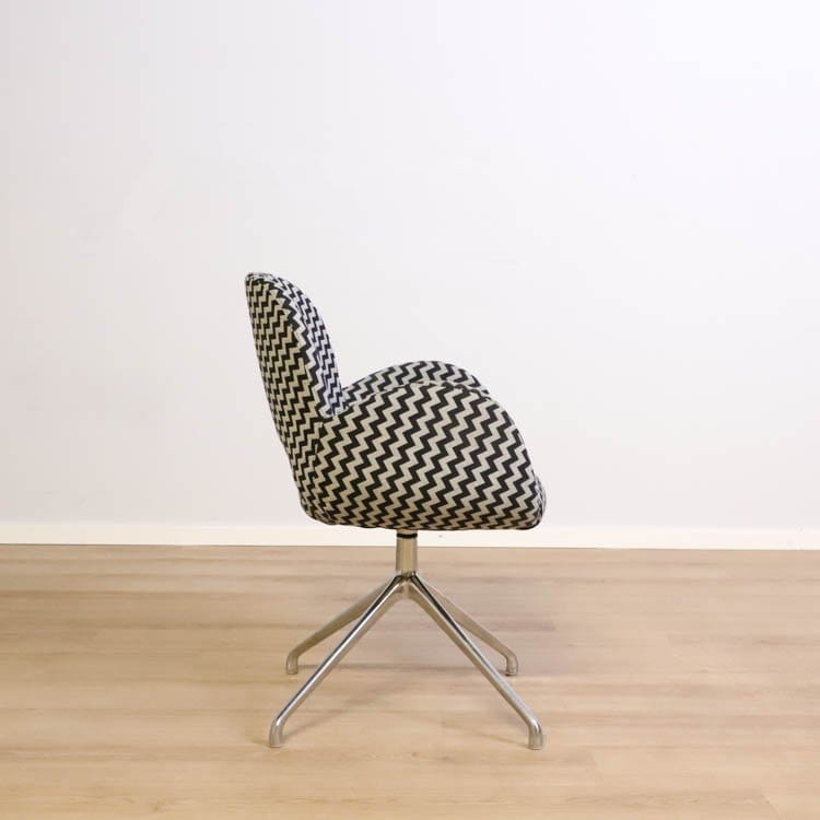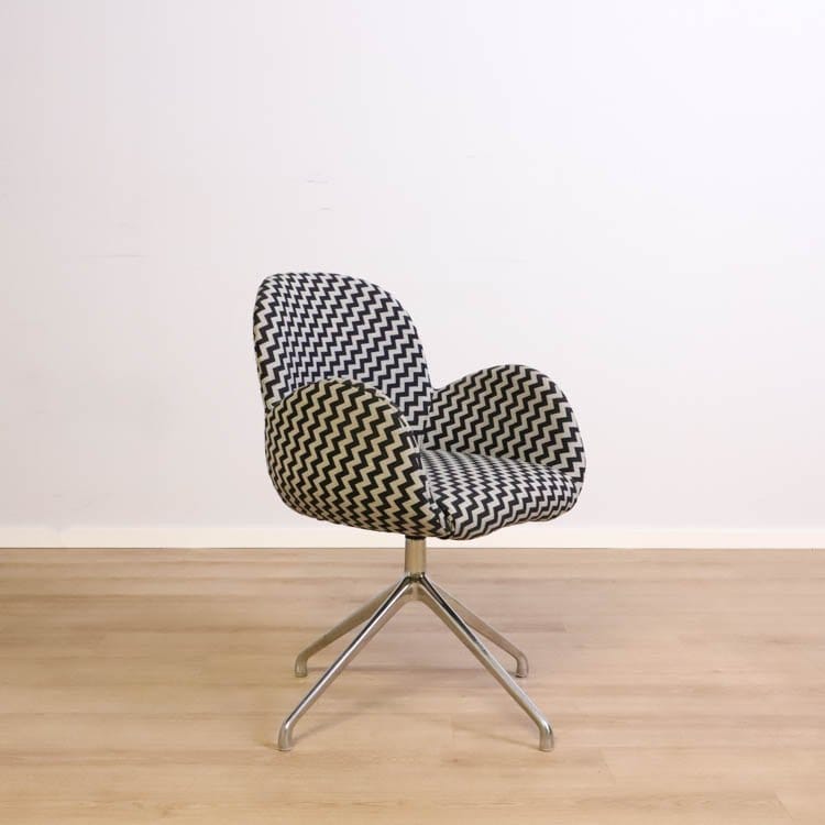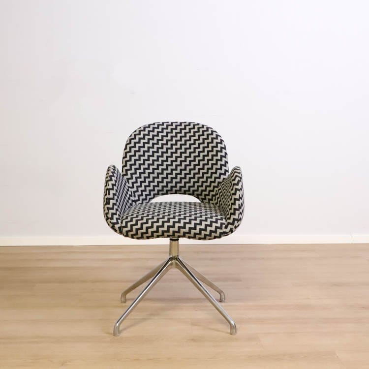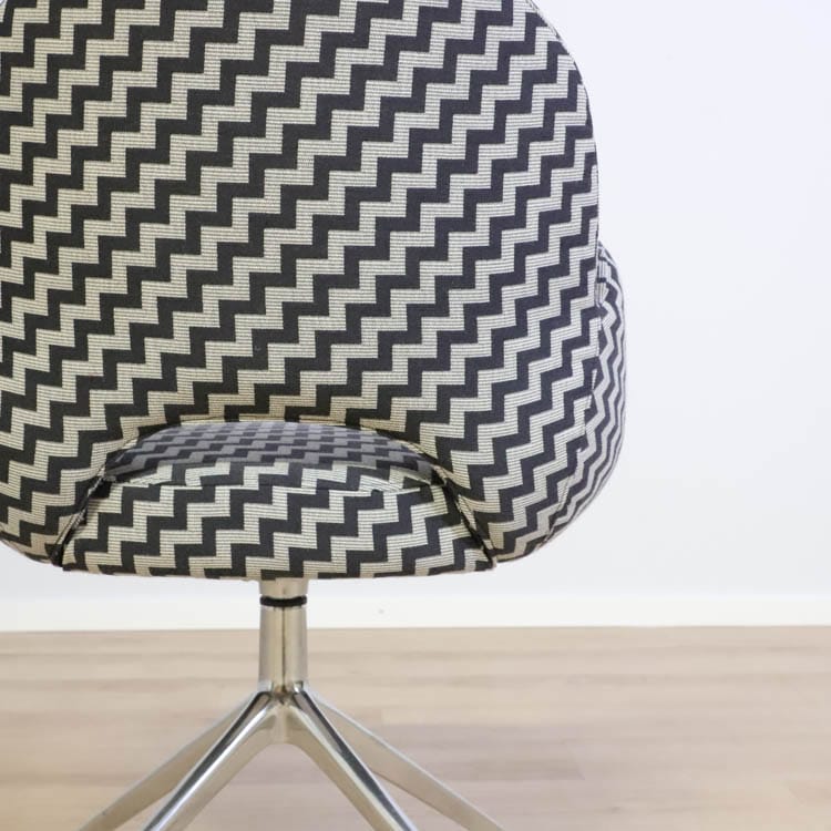 Snygg och funktionell är konferensstolen Bud från DeNona. Med sin snurrbara funktion, kromade metallben och sick sack mönstrade tyg på sitsen sticker den ut bland de övriga stolarna i samma serie. Stoppningen i både sits och rygg är tillverkad av formfast polyeter, ett material som framställs av oljor och inte betraktas som miljöfarligt. En formsäker stol som inte bara ger en bekväm sittupplevelse utan också tillför en touch av stil till konferensrummet eller arbetsplatsen.