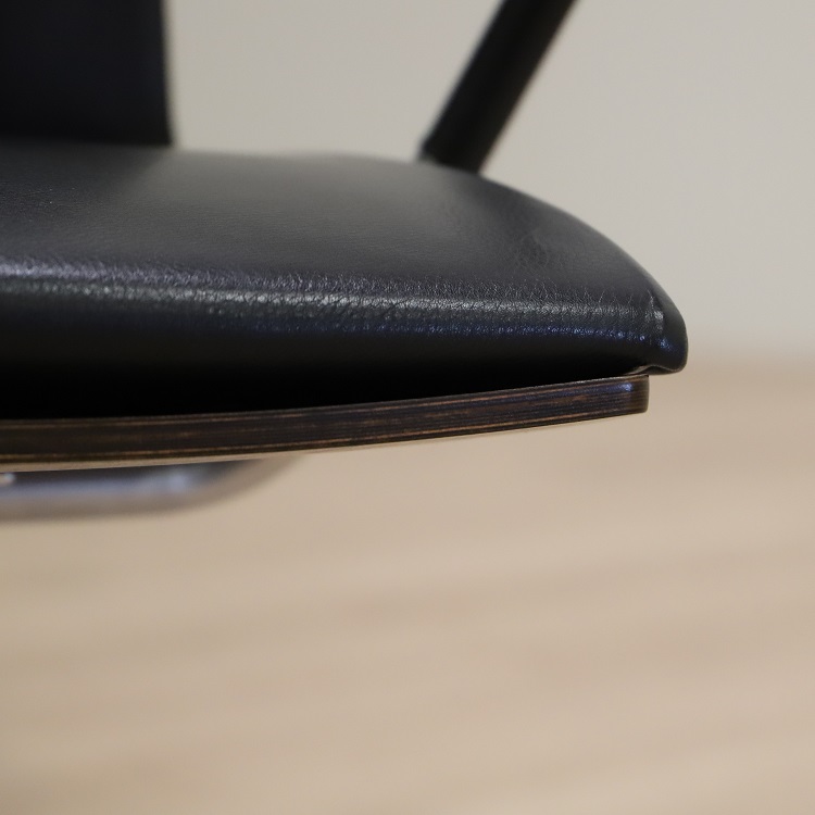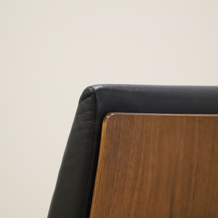 med ryglæn i fineret valnød, kraftigt polstret sæde i sort læder med