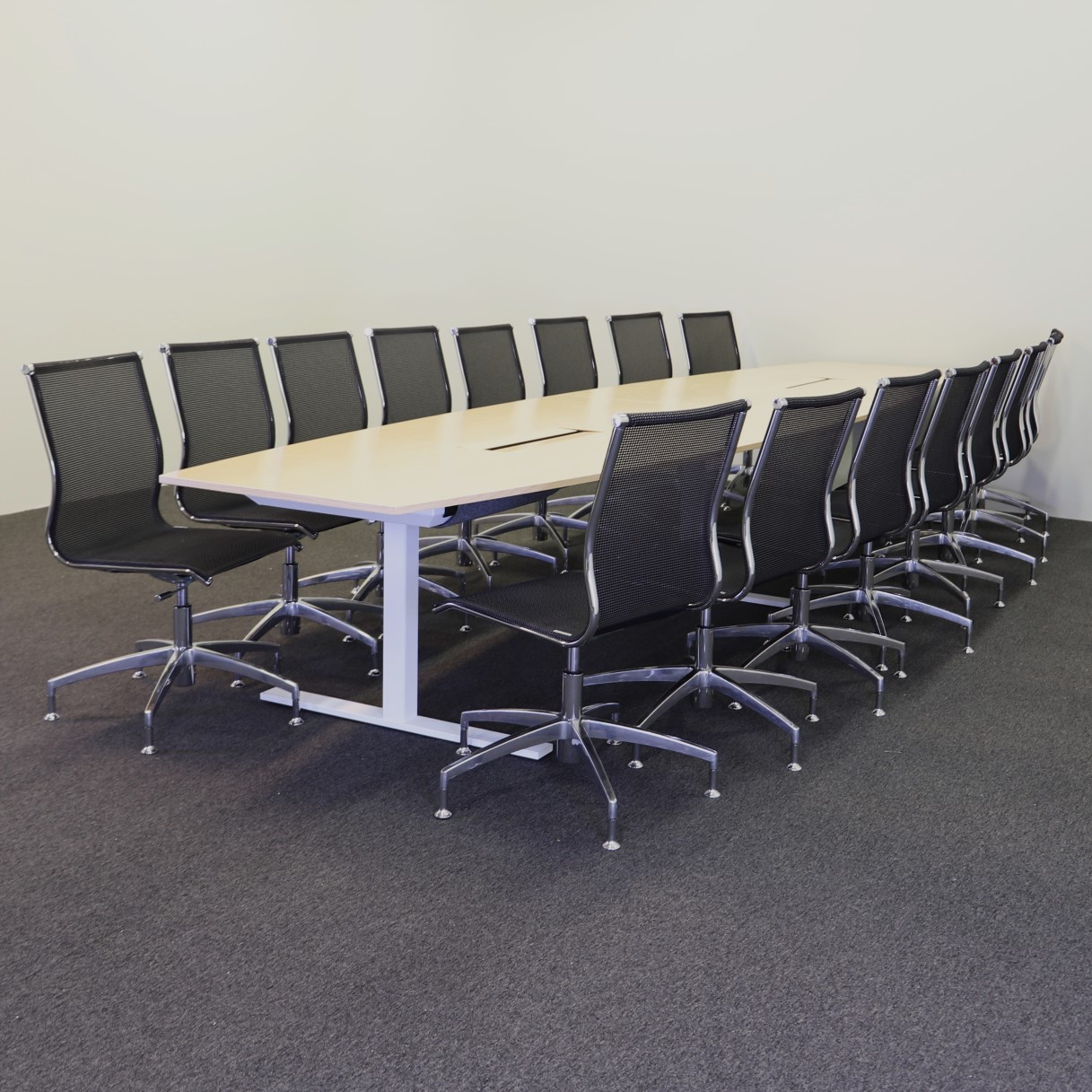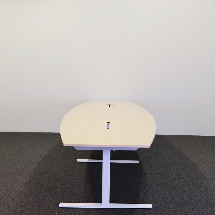 bådformet bordplade til store, effektive møder. Med hvide T-rammer og en smuk