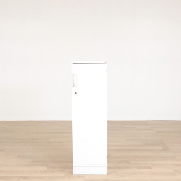 Smisigt personalskåp från Kinnarps som genom sitt nätta format lätt passar in. Skåpet är enkelt att hålla rent tack vare den laminerade vita ytan och gångjärnen öppnar dörren generöst så att du lätt får överblick över innehållet. I skåpet finns ett hyllplan för nycklar och plånbok samt en krok där du kan hänga väskor eller kavajen när du kommer till jobbet eller träningscentret. Skåpet kommer i helvitt utförande.